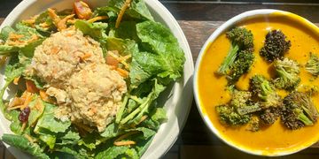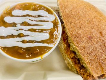 Bowl Option: Spinach, brown rice, soup, avocado mash, scallions, tortilla chips & cashew cream.