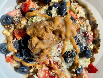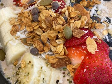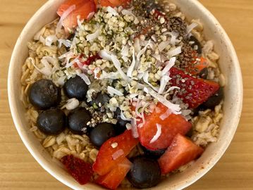 A cup of oats topped with chia seeds, hemp seeds, coconut shreds, strawberries, blueberries, hot water & topped with a touch of cinnamon & agave (add almond butter +$3 or peanut butter +$1.50)