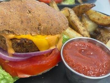 Our house-made sweet potato, pinto bean, quinoa & oat burger served on a brioche bun topped with melted cheese, avocado mash w/ lettuce, tomato, onion & chipotle aioli w/ a handful of our signature baked garlic potato wedges