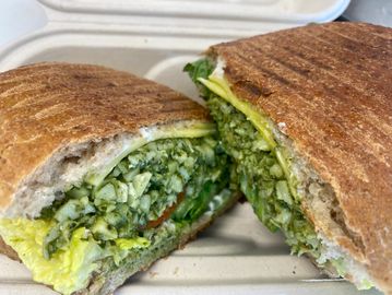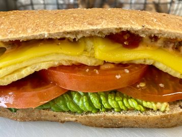 Just Egg patty, tomato, tempeh bacon, lettuce, melted cheese served w/ a dash of ketchup & chipotle aioli