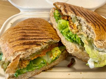 Breaded n baked eggplant topped with homemade marinara sauce, lettuce, tomato, cheese & jalapeños with vegenaise