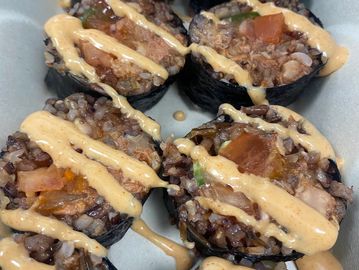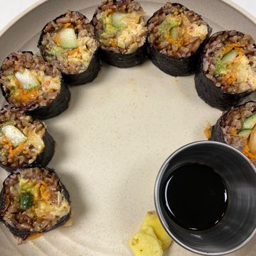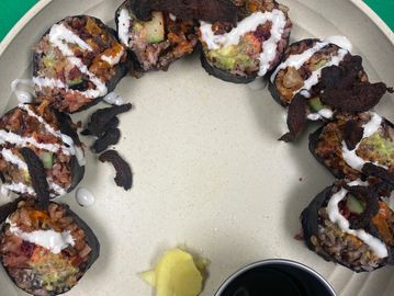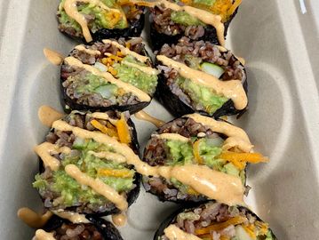 Rolled w/ wild rice filled with avo mash, hearts of palm lobster "meat", cucumbers, carrots & kimchee w/ a teryaki sauce