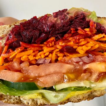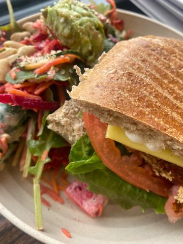 Smoked tempeh bacon, lettuce, avocado mash, tomato & vegenaise