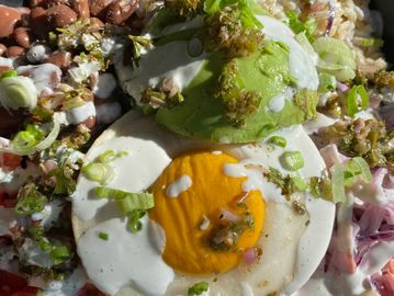 Brown rice, pinto beans, cabbage slaw, pico de gallo, sliced avocado & a sunny side up yo egg topped with cashew cream & chimichurri | *cashew