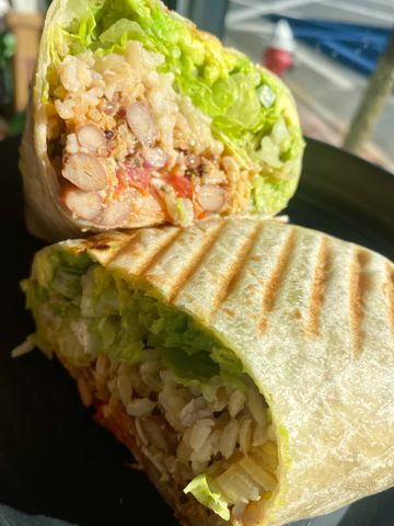 Pinto beans, brown rice & cheese inside a tortilla topped with chipotle sauce, cashew cream, avocado mash & pico de gallo | *gluten & cashew (optional)