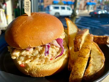 Hearts of Palm “lobster” & cabbage slaw served on a brioche bun with a handful of fries | contains gluten