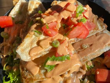 Rolled w/ wild rice filled w/ BBQ shredded jackfruit, onions, jalapeños, tomatoes w/ a sweet chili sauce & chipotle aioli garnished w/ sesame seeds
