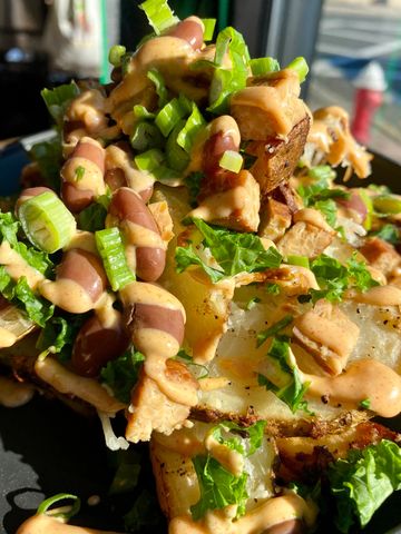 Our signature baked garlic fries topped w/ cheese, pinto beans, smoked tempeh, chopped kale & jalapeños w/ chipotle aioli | *soy