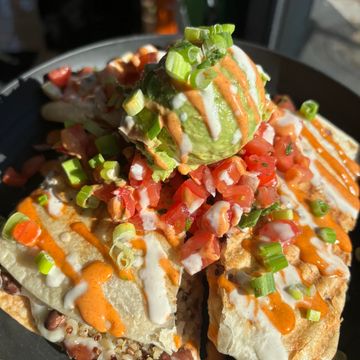 BBQ jackfruit, grilled onions, jalapeños & cheese inside of a crispy tortilla over a bed of lettuce topped with diced tomatoes & chipotle aioli | *gluten