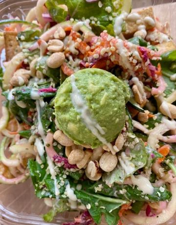 A mix of spiralized zucchini, kale, carrots, beets, onions, hemp seeds, peanuts & baked tofu tossed in our house-made creamy ginger miso dressing topped with avocado mash
