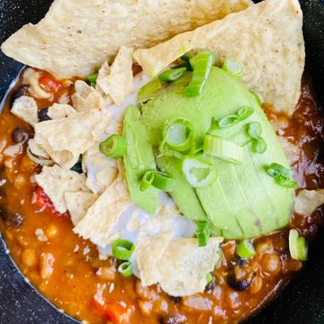 A lentil & black bean soup with roasted bell peppers topped with scallions, tortilla chips & cashew cream.